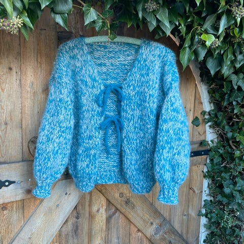 Bowie genseren/cardigan fra MinMote 🩷🧡💛 Strikket i håndfarget Chunky Mohar fra UnTold i fargen Tropesommer. Garnet består av 78% mohair, 13% ull og 9% nylon og cardiganen er sååå myk og luftig ☁️ Vil si den passer XS-L ut fra hvor oversized du vil ha den (er selv størrelse M).