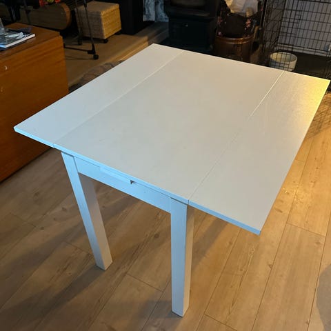 Hvitt bord som kan slås sammen og bæres i håndtak.