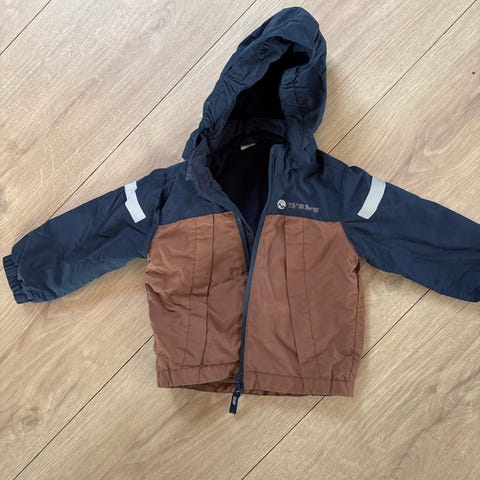 H&M jakke for gutt i størrelse 74. Jakken er laget i bomull og har et flerfarget bil-mønster på mørk bunn. Den har hette, lange ermer og glidelås foran. Passer til hverdagsbruk for små barn til våren
