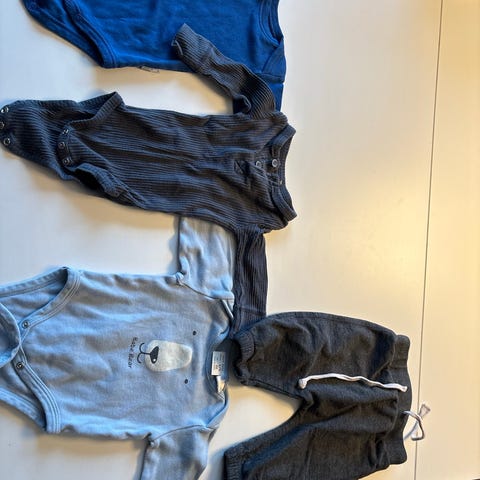 Pent antrekk til baby gutt i strl 80. Skjorten har fått en flekk midt på magen, se bilder. Synes ikke når vest er lukket. Kan brukes med skjortebody eller annen skjorte.