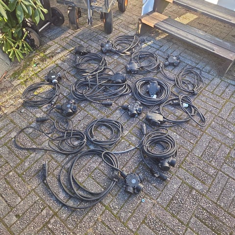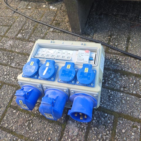 Kraftuttak med flere CEE-kontakter i rød utførelse, levert sammen med tilhørende skjøteledning. Enheten har flere uttak for tilkobling av utstyr som krever CEE-plugg. Skjøteledningen har rød CEE-hannkontakt i den ene enden og tilsvarende kontakt i den andre enden, egnet for bruk der det er behov for fordeling av strøm fra ett punkt til flere uttak. Passer til midlertidige installasjoner som byggeplass, garasje eller andre områder der det trengs robust strømfordeling med CEE-kontakter.