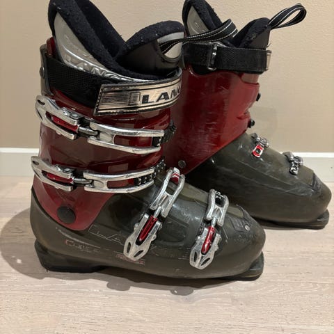 Selger Dalbello alpinstøvler i kombinasjon av grå, svart og rød farge. Støvlene har flere justerbare spenner i metall foran for god tilpasning rundt fot og legg. Innerstøvelen har polstret kant og røde detaljer. Størrelse/mondopoint 285/328mm