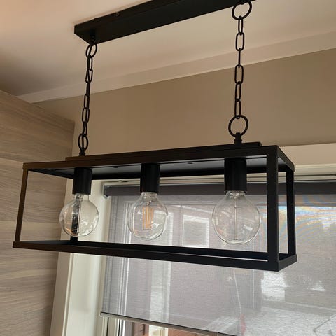 Pent brukt taklampe i sort stål, perfekt til spisestuen. 1 meter bred, 30 cm dyp