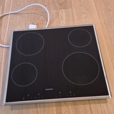 Keramisk platetopp med to kokesoner, beregnet for innbygging. Modellen har touch-betjening i front. Effekt er oppgitt til 3200 W og den kan kobles til 220–240 V, 50/60 Hz. Typenummer er H58ET30. Platetoppen er produsert av Siemens-Electrogeräte GmbH og er merket «Made in Spain».