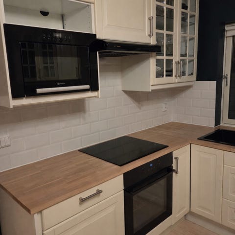 Hel og fin kjøkkeninnredning med over- og underskap. Benkeplate i tre. Kjøkkenvask med blandebatteri (om ønskelig). Selges uten hvitevarer. Skorget for ovnen er helt, men laminatet flasser av etter flere år med varmegang, dette er ikke synlig annet en bak ovnen. Passer perfekt som et enkelt kjøkken, eller i bod/garasje. Ta kontakt om du trenger mål. Må hentes.