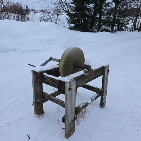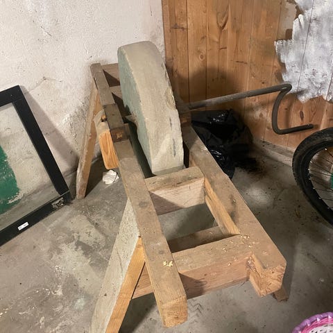 Elektrisk våtslipestein med stor rund steinmontering. Maskinen står på metallstativ og har elektrisk motor med bryterboks. Egnet for sliping og bryning av kniver, redskaper og annet verktøy i verksted, garasje eller landbruksdrift. Nøyaktige mål og effekt er ikke oppgitt.