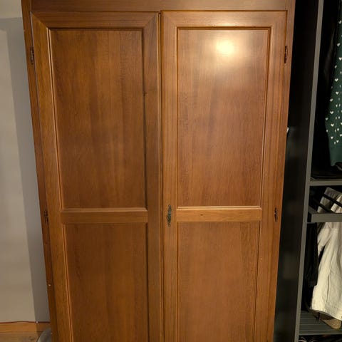 Pent og solid garderobeskap i heltre furu selges. Skapet har et rustikt/landlig uttrykk med buet topp og dekorative beslag, og passer like godt i bolig som på hytte.