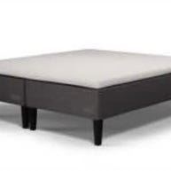 Svane seng med overmadrass i lys tekstil. Sengen består av to separate underdeler som står samlet som en dobbeltseng. Overmadrassen dekker hele liggeflaten. Understellet har lys tresokkel som gir et helhetlig uttrykk. Passer som dobbeltseng på soverom, gjesterom eller andre rom der det er behov for en større sengeløsning.