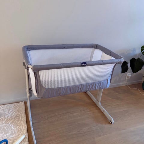 Chicco bedside crib i lys tekstil med metallstativ. Sengen har nettingfelt på siden for bedre lufting og innsyn til barnet. Høyden kan justeres for å passe til foreldreseng, og den ene siden kan åpnes og festes til sengen for nærhet om natten. Tekstiltrekk kan tas av med glidelås. Egnet som babyseng ved siden av foreldreseng i de første månedene.