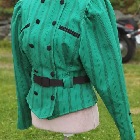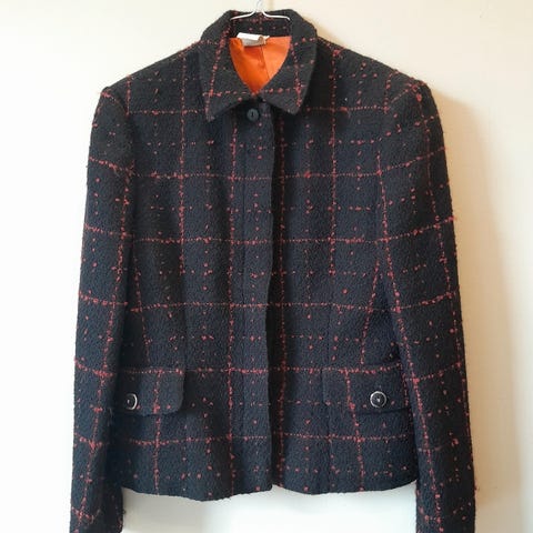 Vintage Versace blazer for dame i størrelse 40. Blazeren er laget i ull og har et flerfarget rutemønster i hovedsakelig svarte, hvite og grå toner. Modellen har klassisk jakkeslag, lange ermer og dekorative detaljer i livet. Passer til bruk over skjorte, topp eller kjole i både formelle og mer uformelle antrekk.
