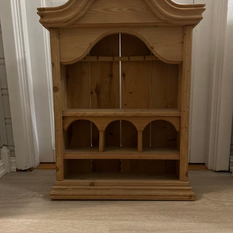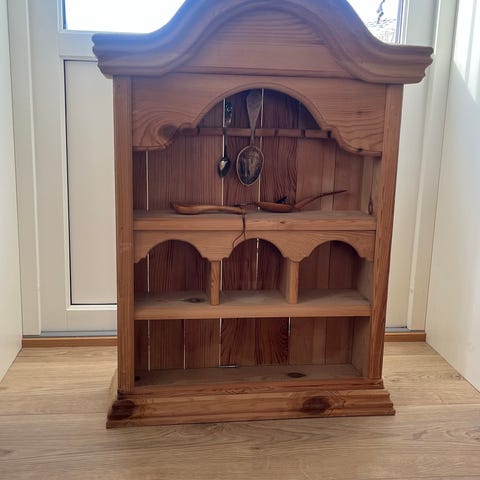 Hjørnehylle i tre med to hyller. Utført i lyst treverk med utskårne detaljer i sidene. Hyllen er utformet for montering i et hjørne og har opphengshull på baksiden. Flott å sette egen farge på den