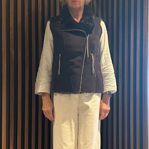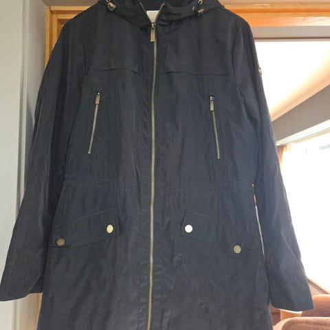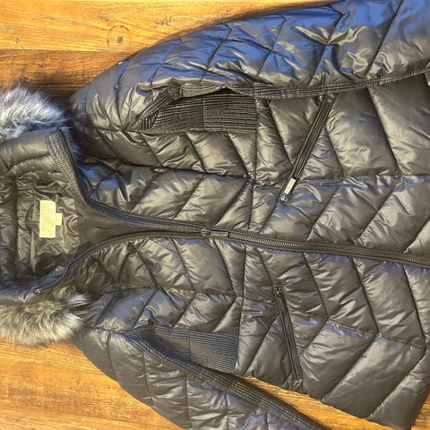 Michael Kors vest til dame i størrelse M. Jakken er grønn og er vattert med horisontale sømmer. Den har glidelås i front og glidelåslommer i sidene og lommer.Avtagbar hette med pelskant ( fuskepels), som kan tas av separat etter behov.