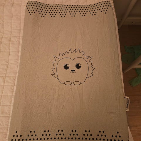 Jollyroom stellematte med uglemotiv. Stellematten har et lyst, stripete trekk med brodert ugle på en gren. Baksiden er ensfarget lys. Passer til stell av baby på stellebord eller andre stabile flater. Materiale og nøyaktige mål er ikke oppgitt av selger.