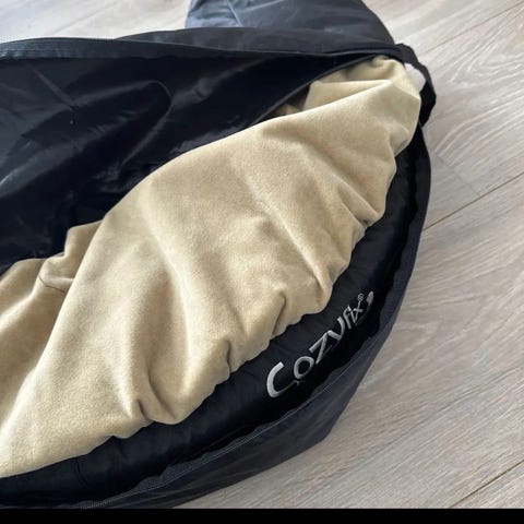 Cozyfix pute i svart ytterstoff med beige innside. Puten har myk tekstil på innsiden og glattere materiale på utsiden. Egnet som støttepute, for eksempel i seng eller stol, der det er behov for ekstra stabilisering eller komfort. Kan brukes av både barn og voksne avhengig av behov og tilpasning.