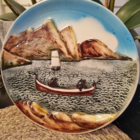 Antikk veggtallerken av Josef Strnact med vakkert relieffmotiv av slott og fjellandskap. Rikt detaljert utførelse og flott, naturlig patina som gir autentisk vintage preg. Stemplet på baksiden. Et dekorativt samleobjekt – perfekt til hytte eller klassisk interiør. Diameter 23,5 cm
