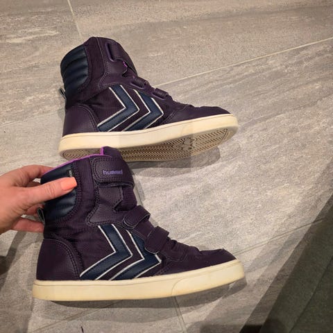 Ubrukte Hummel joggesko / overgangssko for barn i størrelse 37, unisex-modell. Skoene er svarte med hvite detaljer og middels høyt skaft. De har snøring kombinert med borrelås øverst for bedre passform og enkel av- og påkledning. Yttersålen har kraftig mønster for godt grep. Egnet som hverdagssko og fritidssko for barn og unge.