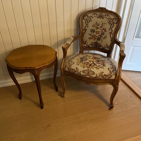 Lenestol med ramme i treverk og stoppede puter. Stofftrekket har blomstrete mønster i dempede farger. Stolen har armlener i tre og dreide ben, samt dekorative møbelnagler langs underkanten av setet. Egner seg som sittemøbel i stue eller lesehjørne.