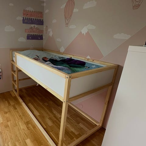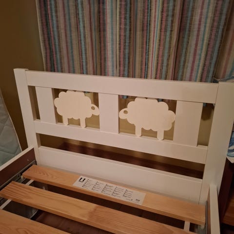 Selger en blå barneseng med sengehest. Sengehest kan flyttes på, da den kun er festet med skruer. Vi kjøpte sengen brukt, og tidligere eier har bygd denne sengen selv.