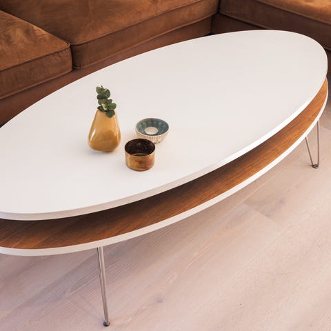 Selger et unikt salongbord laget av kvalitetsmaterialer.