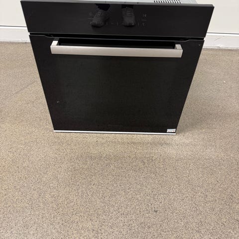 Integrert varmluftsovn i svart utførelse. Ovnen har 3D-varmluftsfunksjon med vifte plassert bak i ovnsrommet for jevn varmefordeling. Fronten har display og dreieknapper for innstilling av temperatur og funksjoner.