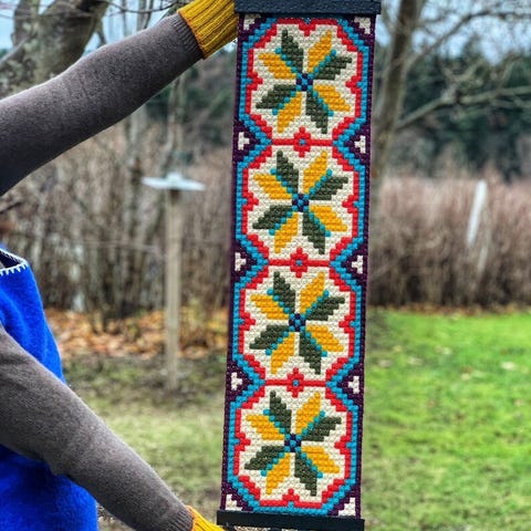 Veggteppe håndlaget i ull med flerfarget, geometrisk og blomsterinspirert mønster. Teppet er smalt og avlangt, med frynser nederst og dekorativt metalloppheng øverst for enkel opphenging på vegg. Passer som veggdekor i stue, gang eller andre rom der man ønsker et tekstilt innslag med mønster og struktur.