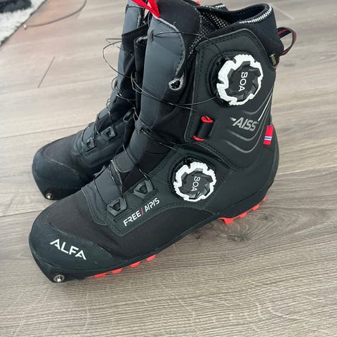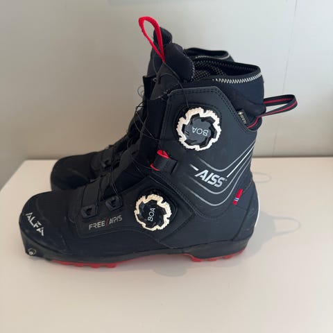 Alfa Free A/P/S skistøvler i svart med røde detaljer. Modellen har høyt skaft og er utviklet for bruk med fjell- eller toppturski. Støvlene har dreiehjul for snøring/stramming på siden, hemper for enkel på- og avtagning samt grovmønstret yttersåle for godt feste på snø og is. Innvendig polstring gir støtte og komfort rundt ankel og fot. Egner seg til turer i variert vinterterreng der det er behov for stabile og varme skistøvler. Støvelen selges grunnet feil størrelse. Derfor lite brukt.