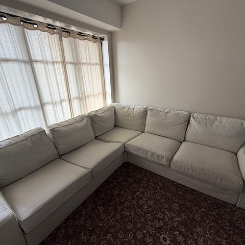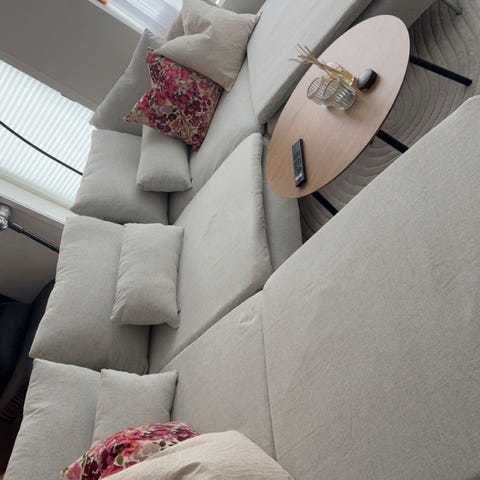 Veldig pent brukt, ser nesten ny ut. Trekket vaskes før overlevering uansett. Bena er spraylakkert sorte. Kan enkelt bytte til andre bein om ønskelig. Røykfritt hjem. Pynteputene og pleddet følger naturligvis ikke med. Bor i 2. etasje med heis på Bislett/St.Hanshaugen.