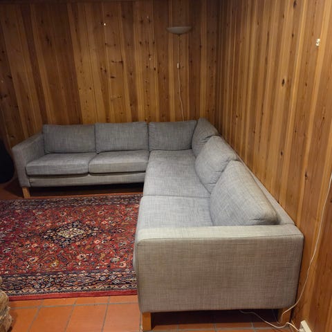 Søt liten 3 seters sofa. Kjempegod å sitte i. Stoffet har blitt slitt i sittedelen og revnet litt i stoffet.