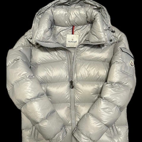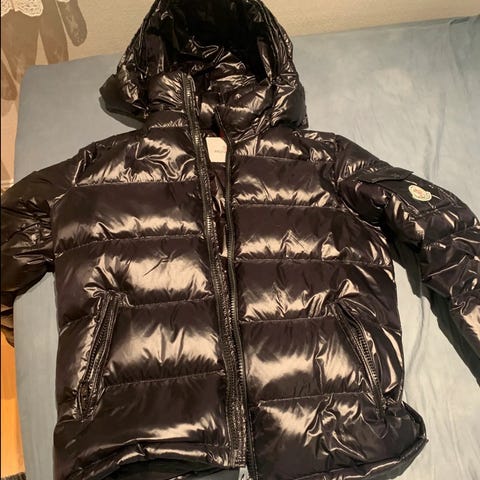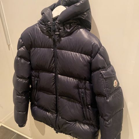 Moncler dun vinterjakke for herre i størrelse M. Jakken er blå og fylt med dun, med glansfullt ytterstoff. Den har hette, gjennomgående glidelås i front og flere lommer, inkludert brystlomme med klaff og logo. Egnet som varm ytterjakke i kaldt vintervær. God kvalitet. Qr kodr scannes