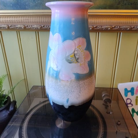 En vase med flytende blå dekor. Den er 17cm høy og 13cm bred. Vasen er i flott stand. Shbo 190 kr pluss porto. Står i 24t etter 1. Bud. 5 min gjelder. Bruker ikke fiks ferdig.