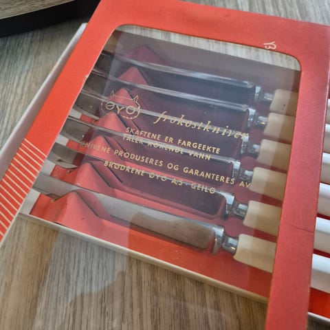6 Øyo bordkniver ) 26 cm) i orginaleske selges.