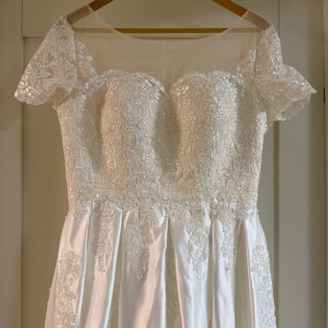 Selger en ubrukt skreddersydd brudekjole. Ble sydd før vektnedgang og ikke blitt justert på da det var for omfattende arbeid. Kjolen har 2/3 dels armer med blonder på øvre del av kjolen og i ermelengden. Litt paljetter på bryst som skaper en liten glans og det lille «ekstra». Glidelås i ryggen, dekket med pene knapper.