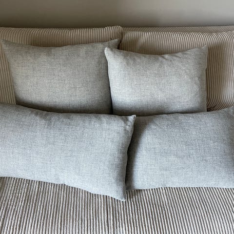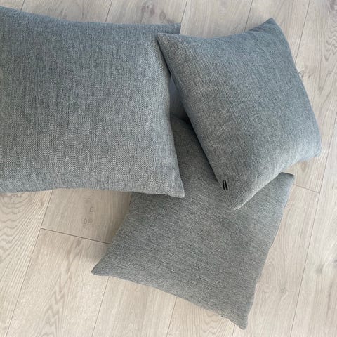 Bolia sofaputer i lysegrå tekstil. Trekkene har enkel, rett fasong og lukkes på baksiden. To kvadratiske og to avlange pynteputer, egnet til bruk i sofa, lenestol eller på seng. Nøytral farge som kan kombineres med ulike interiørstiler.