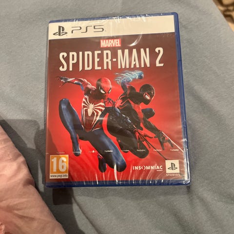 PlayStation 5 Marvel’s Spider-Man 2 spill. Fysisk utgave på disk i standard PS5-cover. Spillet er merket med aldersgrense 16 år (PEGI 16). Utviklet for PlayStation 5-konsoll og spilles med PS5-kontroller. Inneholder actionspill med superhelt-tema satt i Spider-Man-universet. Tekst og omslag er på europeisk utgave med informasjon om innhold, aldersmerking og brukervilkår på baksiden av coveret.