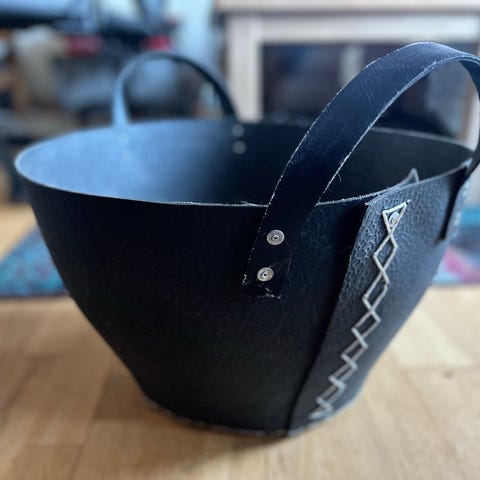 Kobberfarget vedkurv i metall med hamret overflate. Kurven har dekorative vertikale felt og bærehåndtak i metall på sidene. Den står på små føtter som løfter den litt opp fra gulvet. Egnet til oppbevaring av ved eller som dekorativ oppbevaringskurv i stue eller ved peis/ovn.