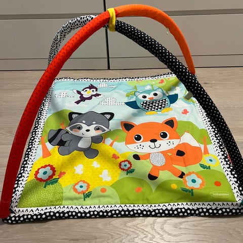 Babygym med myk lekematte og buer. Matten har fargerikt dyremotiv. Over matten henger flere aktivitetsleker, blant annet speil, bite- og gripeklosser samt en liten kosedyr-ape. Babygymmen er egnet for spedbarn som ligger på rygg eller mage, og gir mulighet for visuell og taktil stimulering under lek.
