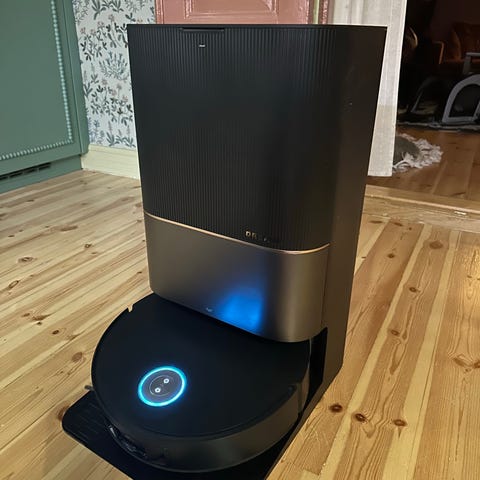 Tømmestasjonen fungerer som lade- og dokkingstasjon, og har pose for oppsamling av støv. På bildene følger det med tilbehør som ekstra moppeskiver, støvposer, støvfilter, ekstra børster, strømkabel, rengjøringsverktøy og gulvrens.