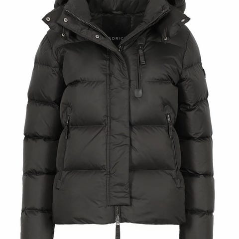 Cedrico dunjakke for dame i størrelse M. Jakken er brun og fylt med dun. Modellen har høy krage og hette, og er vattert med horisontale sømmer. Glidelås i front. Passer som ytterjakke i kaldere vær