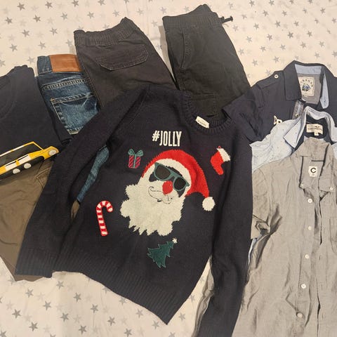 Pakken inneholder flere plagg for gutt i størrelse 146/152, blant annet gensere og bukser. Ett av plaggene er en mørk genser med Levi's-logo. Det følger også med andre over- og underdeler i ulike farger og mønstre, som jeans, rutete bukser og gensere. Klærne passer til hverdagsbruk for gutt i størrelse 146/152.