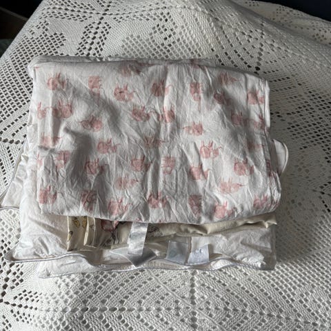 Sengesett fra KID som passer til, det er to ulike sett i lyse, nøytrale farger, og med blomster og dyremønster.