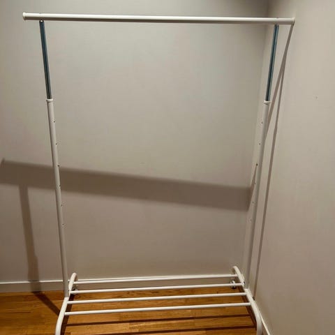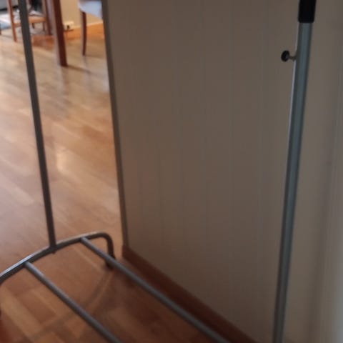 Garderobestativ, metall. Bredde 115cm, Høyde justerbart. Ingen skade, fremstår som ubrukt.