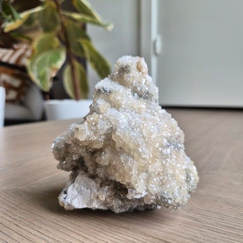 Vakker og energirik rå kvartskrystall, i naturlig form med mange små krystallpunkter. Denne klyngen har et jordende og samtidig rensende uttrykk, og egner seg perfekt til energiarbeid, meditasjon, altar eller som et harmonisk blikkfang i hjemmet.