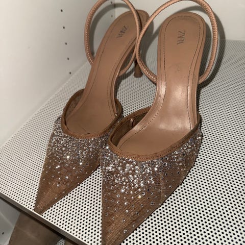 Bianco hæler i størrelse 40. Skoene har en grå glitteroverflate og smal hæl. Lukket tå og klassisk pumps-fasong. Passer til bruk ved formelle anledninger, fest eller andre situasjoner der man ønsker et mer pyntet uttrykk.
