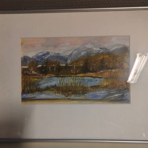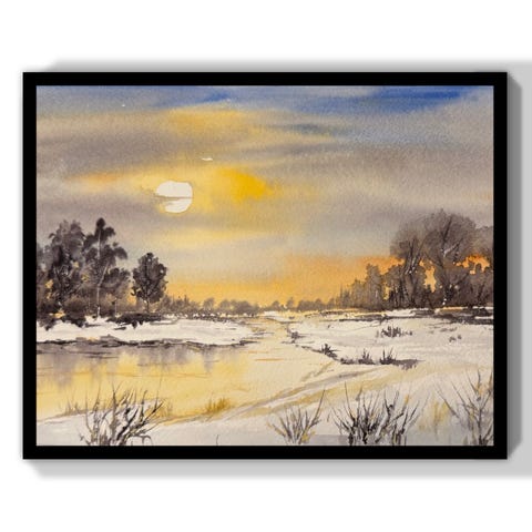 Akvarellmaleri som viser et vinterlandskap med elv, steinbro og et lite hus omgitt av snø. Fargene domineres av hvitt, blått og grått, med innslag av varme toner i broen og refleksjoner i vannet.