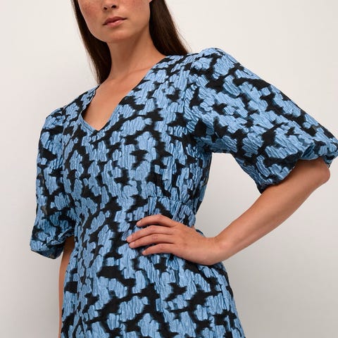 Kjolen har litt puff på ermene, noe som gir et feminint uttrykk.