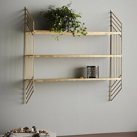 Veggoppbevaring i messing, som enkelt kan organiseres slik man ønsker. Beholdere henger på ved hjelp av kroker. Pent brukt, men har fått et lite merke på undersiden av den ene beholderen.