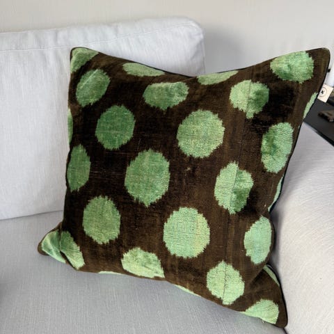 Forside: Ikat Velvet (80% Silke, 20% Cotton)· Bakside: Silk Ikat (80% Silke, 20% Cotton)· Mønster: Håndvevd, håndfarget· Pleie: Kun renseri· Lukning: Glidelås i søm·