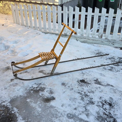 Rapp Tarzan sparkstøtting i tre. Voksen-størrelse. Klassisk modell med sete av trelemmer og metallmeier. Sparken er sammenleggbar. En spark som er nesten ikke brukt. Innsatt med ett par lag med gylden treolje