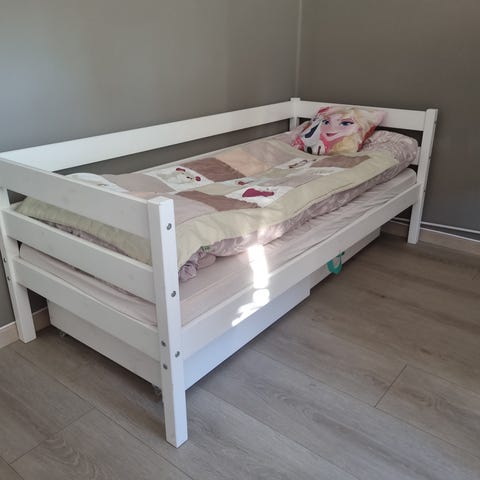 En barneseng i god kvalitet. Den er i hvitbeiset heltre. Den er enkel å skru fra hverandre og frakte,