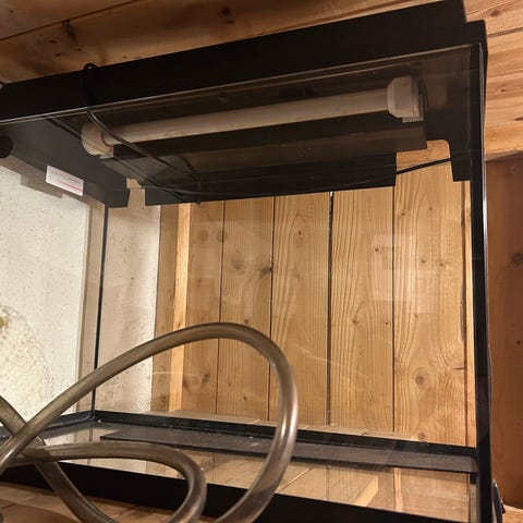 Brukt akvarium med pumpe, lys og mye utstyr selges. En liten sprekk i glasset på lokket, men det er limt og funker som det skal.